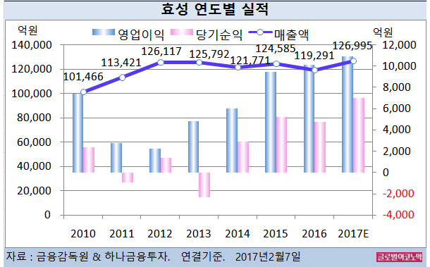 효성의 2016년 연결기준 매출액은 11조9291억원(전년비 -4.2%), 영업이익 1조163억원(전년비 +7.0%), 당기순이익 4754억원(-9.6%)으로 잠정 집계됐다.