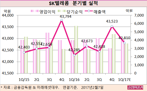 이 연구원은 SK텔레콤의 올해 1분기 연결기준 매출액이 4조2810억원(전년동기비 +1.2%), 영업이익 4050억원(전년동기비 +0.7%), 당기순이익 4747억원(전년동기비 -36.9%)을 기록할 것으로 전망하고 있다.