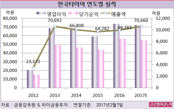고 연구원은 한국타이어의 올해 연결기준 매출액이 7조660억원(전년비 +6.6%), 영업이익 1조830억원(전년비 -1.9%), 당기순이익 8190억원(전년비 -4.0%)을 기록할 것으로 내다보고 있다.