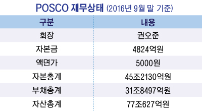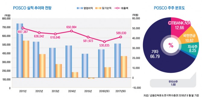 포스코의 2016년 연결기준 매출액은 53조835억원(전년비 -8.8%), 영업이익 2조8443억원(전년비 +18.0%), 당기순이익 1조482억원(전년비 -1189.6%)으로 잠정 집계됐다.
