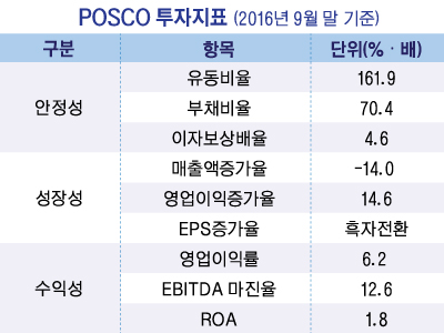 POSCO는 2016년 9월 말 현재 안정성 부문에서는 상대적으로 뛰어나나 성장성과 수익성 부문에서는 다소 미흡한 것으로 나타났다.