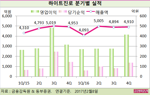 차 연구원은 하이트진로의 지난해 4분기 영업이익이 시장 컨센서스를 35.8%, 동부증권 예상치를 16.4% 상회했다고 평했다.