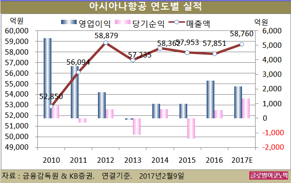 아시아나항공의 2016년 연결기준 매출액은 5조7851억원(전년비 -0.2%), 영업이익 2570억원(전년비 +161.4%), 당기순이익 543억원(전년비 -139.0%)으로 잠정 집계됐다.