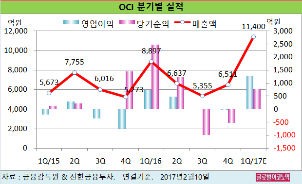 OCI의 2016년 연결기준 매출액은 2조7400억원(전년비 +19.1%), 영업이익 1208억원(흑자전환), 당기순이익 2188억원(전년비 +20.2%)으로 잠정 집계됐다.