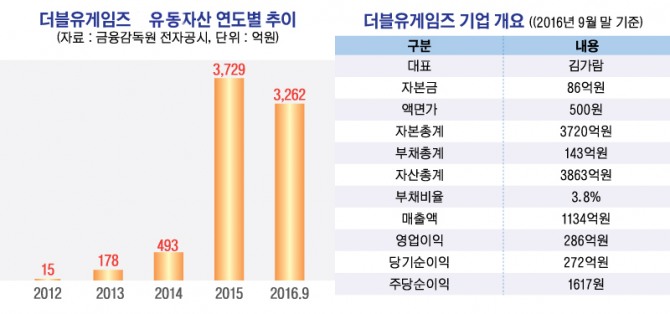 더블유게임즈의 유동자산은 지난 2012년 말 15억원에 불과했으나 2013년 말 178억원, 2014년 말 493억원에서 2015년 코스닥에 상장하면서 그해 말 3729억원으로 껑충 뛰었다.