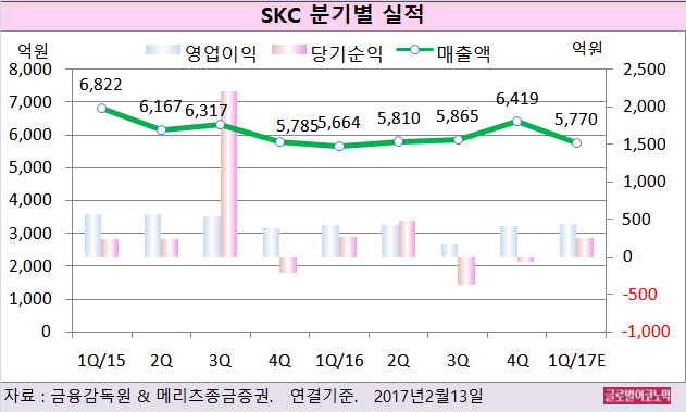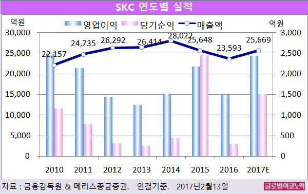 SKC의 2016년 연결기준 매출액은 2조3593억원(전년비 -8.0%), 영업이익 1495억원(전년비 -31.5%), 당기순이익 305억원(전년비 -87.6%)으로 잠정 집계됐다.