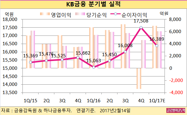 KB금융의 2016년 연결기준 순이자이익은 6조4025억원(전년비 +3.2%), 영업이익 1조6769억원(전년비 -7.9%), 당기순이익 2조1902억원(전년비 +26.8%)으로 잠정 집계됐다.