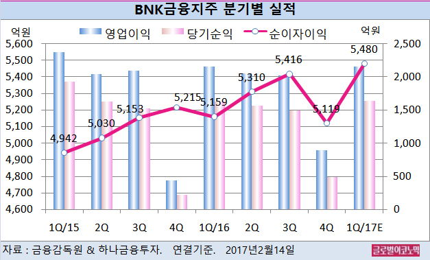 한 연구원은 BNK금융의 올해 1분기 연결기준 순이자이익이 5480억원(전년동기비 +6.2%), 영업이익 2161억원(전년동기비 +0.2%), 당기순이익 1643억원(전년동기비 +0.7%)에 이를 것으로 보고 있다.
