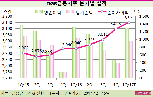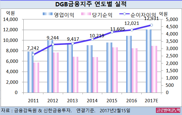 DGB금융의 2016년 연결기준 순이자이익은 1조2021억원(전년비 +3.6%), 영업이익 3869억원(전년비 +12.8%), 당기순이익 3019억원(전년비 -2.1%)으로 잠정 집계됐다.