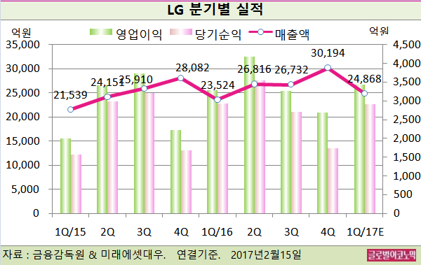 미래에셋대우 정대로 연구원은 LG의 올해 연결기준 매출액이 11조7721억원(전년비 +9.8%), 영업이익 1조6442억원(전년비 +22.3%), 당기순이익 1조3619억원(전년비 +24.8%)을 기록할 것으로 내다보고 있다.