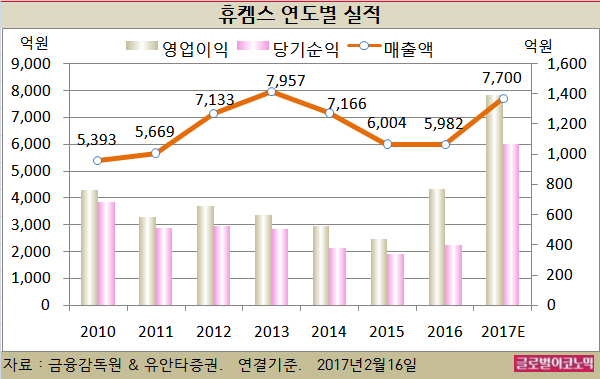 휴켐스의 2016년 연결기준 매출액은 5982억원(전년비 -0.4%), 영업이익 769억원(전년비 +76.4%), 당기순이익 399억원(전년비 +16.7%)으로 잠정 집계됐다.
