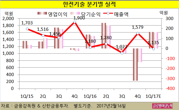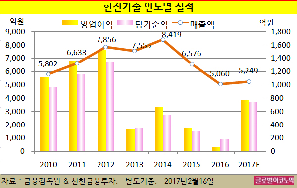 한전기술의 2016년 별도기준 매출액은 5060억원(전년비 -23.1%), 영업이익 59억원(전년비 -83.0%), 당기순이익 178억원(전년비 -42.6%)으로 잠정 집계됐다.