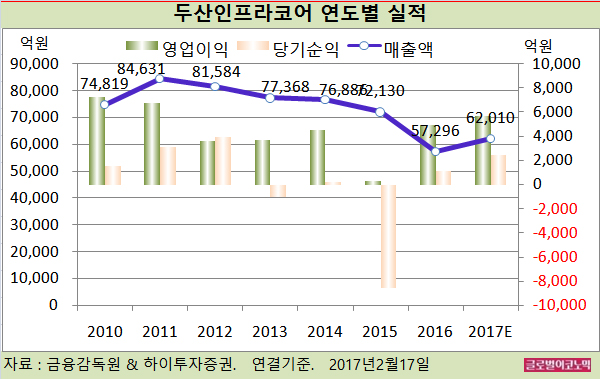 두산인프라코어의 2016년 연결기준 매출액은 5조7296억원(전년비 -20.6%), 영업이익 4908억원(전년비 +1691.2%), 당기순이익 1160억원(흑자전환)으로 잠정 집계됐다.