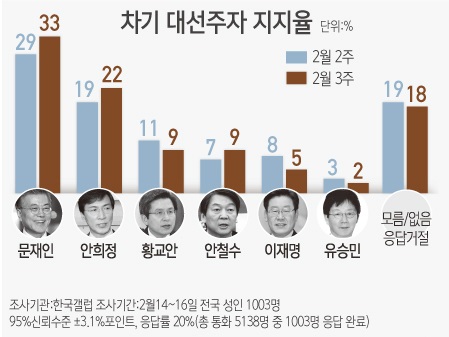 뉴시스에 따르면 17일 여론조사 기관 한국갤럽은 지난 14~16일 이틀 간 전국 성인 남녀 1003명을 대상으로 실시한 2월3주차 여론조사에서 문 전 대표는 33%의 지지율로 1위를 질주했고 안 지사는 22%로 2위, 황 권한대행은 9%로 안 전 대표(9%)와 함께 공동 3위를, 이재명 성남시장이 5%로 5위를 기록했다고 밝혔다.