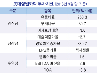 롯데정밀화학은 2016년 9월 말 현재 안정성 부문에서는 탁월한 것으로 나타났으나 성장성과 수익성 부문에서는 다소 미흡한 편이다.