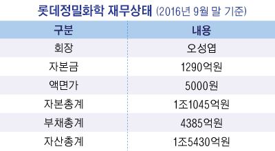 롯데정밀화학의 2016년 연결기준 매출액은 1조1107억원(전년비 -4.4%), 영업이익 297억원(전년비 +1042.3%), 당기순이익 -435억원(적자전환)으로 잠정 집계됐다.
