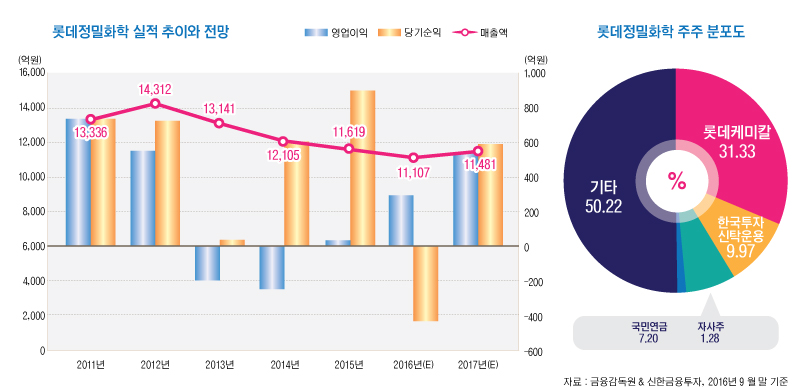 한 연구원은 “롯데정밀화학이 2017년부터 연간 영업이익이 600억원 전후가 되고 롯데그룹 피인수 이후 지연됐던 성장전략도 구체화될 것”이라며 “PBR(주가순자산비율)은 2017년 기준 0.7배로 역사적 저점 수준”이라고 평가했다.