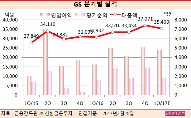 이 연구원은 GS의 올해 1분기 연결기준 매출액이 3조5400억원(전년동기비 +14.6%), 영업이익 4770억원(전년비 +46.5%), 지배주주 순이익 1857억원(전년동기비 +22.2%)에 이를 것으로 보고 있다.