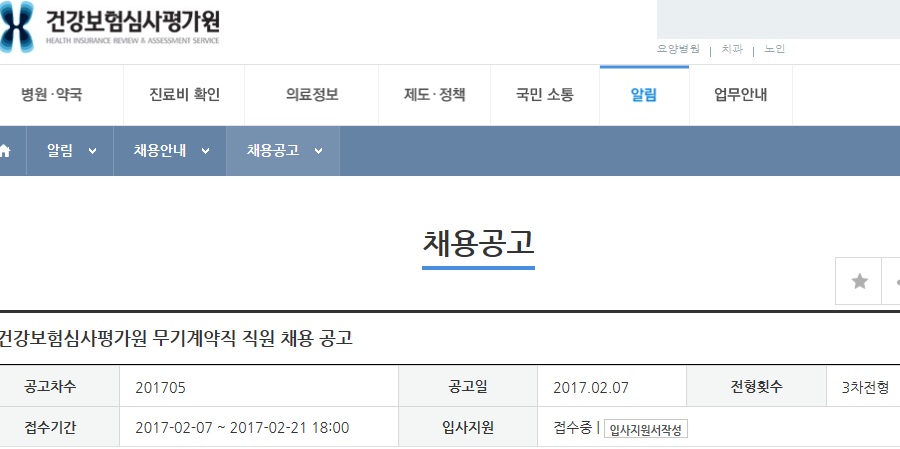 ○ 입사지원서 작성 전 첨부된 채용 공고문을 숙지하시고, 응시원서는 본 화면 상하단의 "입사지원서 작성"을 클릭하시어 기입하여 주시기 바랍니다.