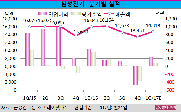 미래에셋대우 박원재 연구원은 “삼성전기가 인력 구조조정을 위해 지난해 상반기 500억원, 하반기 300억원 수준의 비용을 지출했다”면서 “2017년에 800억원의 영업이익 상승 효과로 나타날 것”이라고 진단했다.