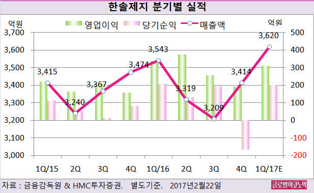한솔제지의 2016년 4분기 별도기준 매출액은 3414억원(전년동기비 -1.7%), 영업이익 193억원(전년동기비 +22.2%), 당기순이익 -168억원(적자전환)으로 잠정 집계됐다.