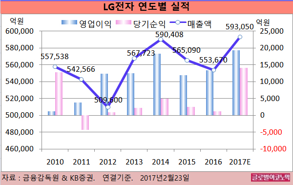 김 연구원은 LG전자의 올해 연결기준 매출액이 59조3050억원(전년비 +7.1%), 영업이익 1조9290억원(전년비 +44.2%), 당기순이익 1조4040억원(전년비 +1011.6%)에 이를 것으로 보고 있다.