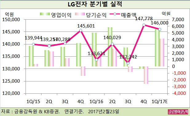 KB증권 김동원 연구원은 LG전자의 올해 1분기 연결기준 매출액이 14조6000억원(전년동기비 +9.3%), 영업이이 5580억원(전년동기비 +10.5%), 당기순이익 4185억원(전년동기비 +111.3%)에 이를 것으로 전망했다.