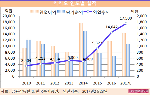 김 연구원은 카카오의 올해 연결기준 영업수익이 1조7500억원(전년비 +19.5%), 영업이익 1430억원(전년비 +23.2%), 당기순이익 1060억원(전년비 +57.7%)에 이를 것으로 내다보고 있다.