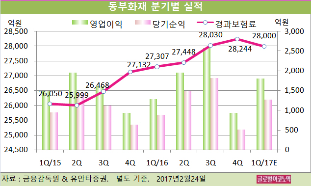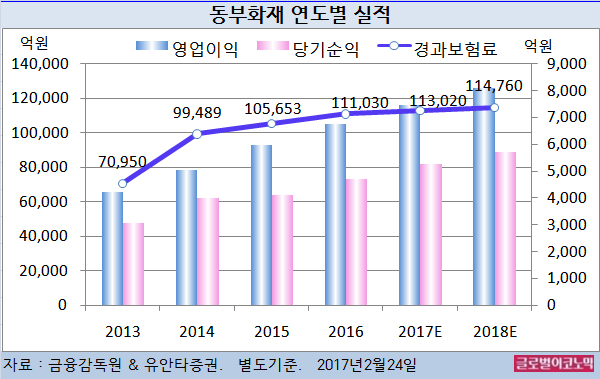동부화재의 2016년 별도기준 경과보험료는 11조1030억원(전년비 +5.1%), 영업이익 6753억원(전년비 +13.1%), 당기순이익 4702억원(전년비 +13.9%)으로 잠정 집계됐다.