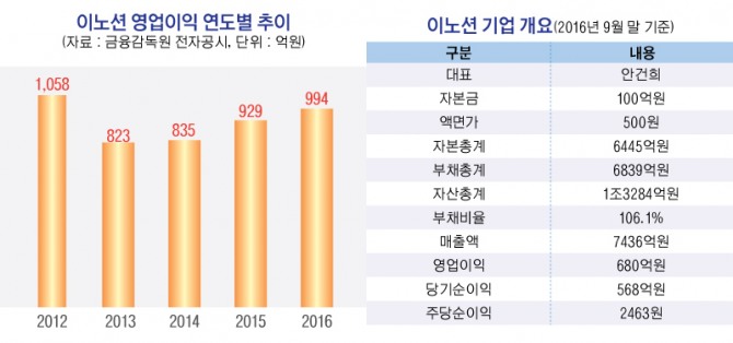 이노션의 2016년 연결기준 매출액은 1조516억원(전년비 +6.4%), 영업이익 994억원(전년비 +7.0%), 당기순이익 780억원(전년비 +0.0%)으로 잠정 집계됐다.