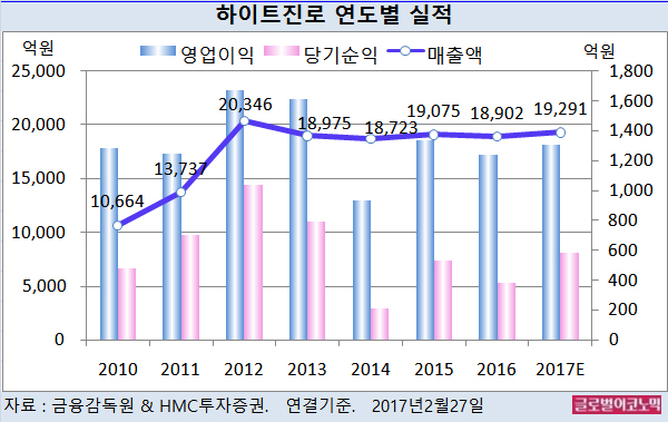 조 연구원은 하이트진로의 올해 연결기준 매출액이 1조9291억원(전년비 +2.1%), 영업이익 1303억원(전년비 +4.8%), 당기순이익 580억원(전년비 +51.0%)에 이를 것으로 내다보고 있다.