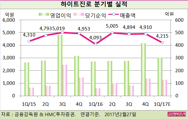 조 연구원은 하이트진로의 올해 1분기 연결기준 매출액 4215억원(전년동기비 +3.0%), 영업이익 303억원(전년비 +11.4%), 당기순이익 127억원(전년동기비 +108.2%)을 기록할 것으로 보고 있다.