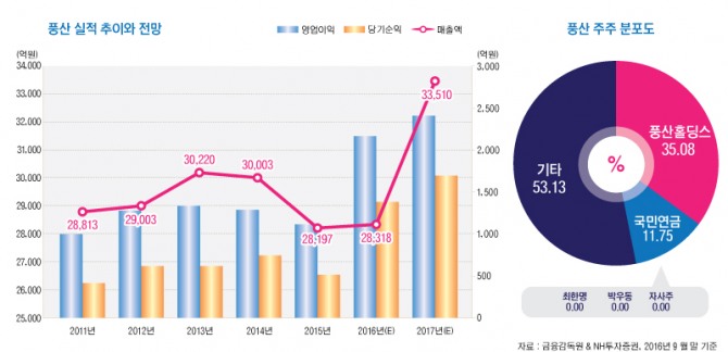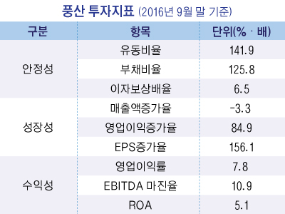 풍산은 2016년 9월 말 현재 안정성, 성장성, 수익성 부문에서 골고루 우수한 편이다.