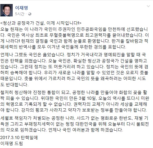 이 시장은 이날 자신의 페이스북에 <청산과 공정국가 건설, 이제 시작입니다!>라는 제목의 글을 통해 이같은 입장을 피력했다.