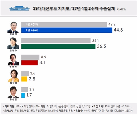 이미지 확대보기13일 리얼미터가 MBN·매일경제신문 의뢰로 전국 성인 1525명을 대상으로 지난 10∼12일 실시해 발표한 4월 2주차 주중집계 여론조사결과 자료에 따르면 문 후보는 지난주보다 2.6%포인트 오른 44.8%를 기록, 15주 연속 1위를 차지했다.