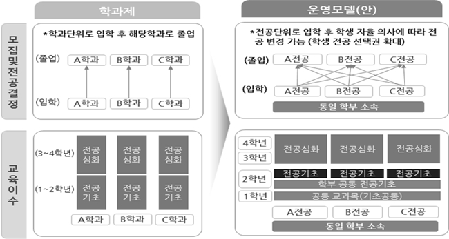 졸업할 때에는 학생이 선택한 전공의 심화교과목을 수강하여 취업으로 연계시킨다. 이러한 학제 개편의 배경은 교육부가 2주기 대학 구조개혁 기본계획에서 강조한 대학의 체질 개선과 경쟁력 강화를 목적으로 하고 있다. 특히 입학한 전공과 다른 전공으로 졸업할 수 있게 함으로써 유연하고 탄력적인 인재 양성 체제로 전환한다는 방침이다.