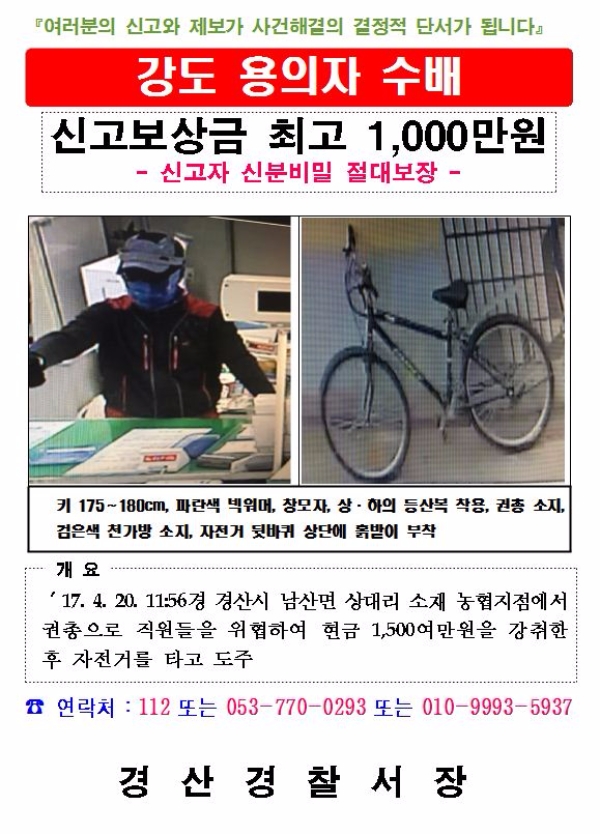 [글로벌이코노믹 온기동 기자] 경북지방경찰청은 20일 경산 자인농협 하남지점에서 발생한 총기강도 사건 용의자에 대한 신고보상금을 1000만원으로 올렸다고 21일 밝혔다.