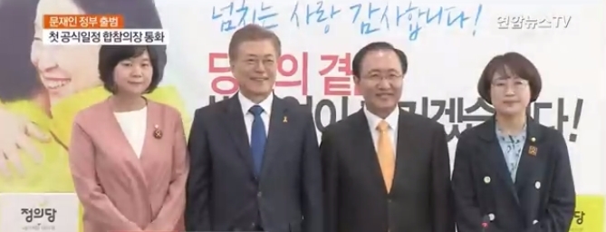 이어 노회찬 대표는 "우리당 이름이 지금 있는 원대 5당 중 가장 오래된 이름이다"며 문재인 대통령에 "정의당에 찾아주신 첫번째 대통령이다"고 말했다.