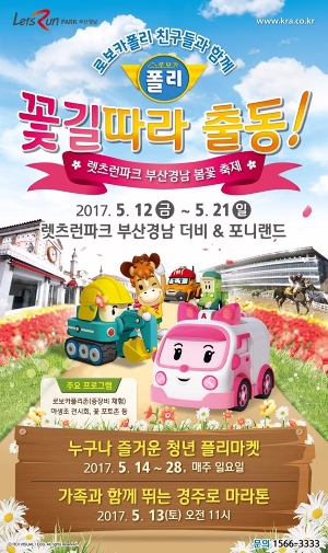 이미지 확대보기한국마사회 렛츠런파크 부산경남(본부장 최원일)은 말을 테마로 한 꽃 축제인 '로보카폴리 친구들과 함께하는 5월 봄꽃 축제'를 오는 12일부터 21일까지 2주간 금, 토, 일 렛츠런파크 부산경남 일원에서 개최한다고 밝혔다.