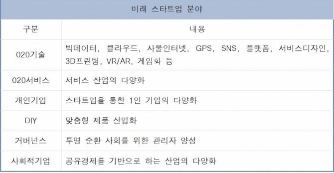 4차 산업혁명에 따른 일자리 변화 속 특징 중의 하나는 다양한 스타트업이 발생될 것으로 보인다.