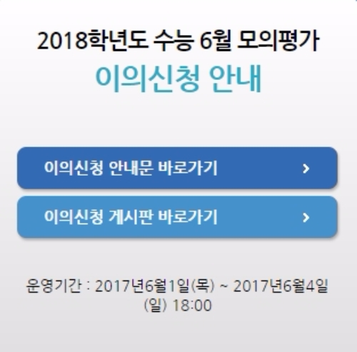 이미지 확대보기한국교육과정평가원에 따르면 이의 신청 기간은 2017년 6월 1일(목) ~ 6월 4일(일) 18:00까지다.