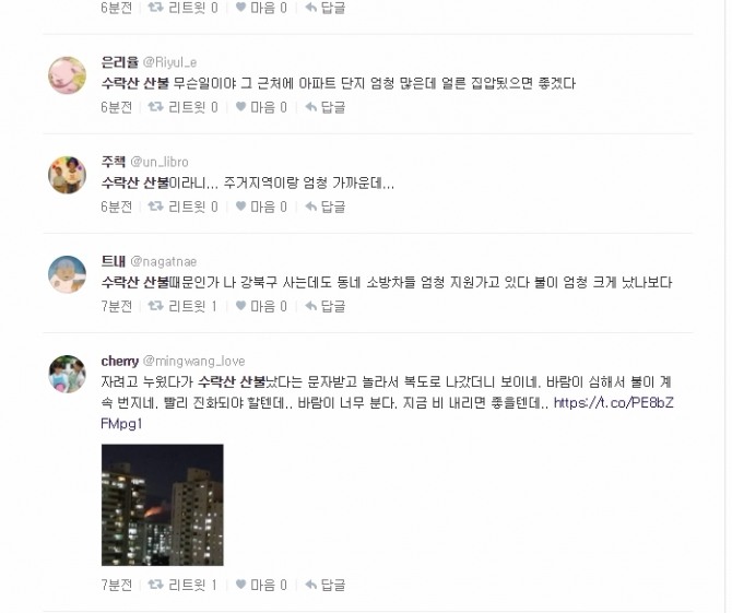 국민안전처는 “오후 9시30분 현재 노원구 상계동 한신아파트 인근 수락산 산불 발생. 야간 등산객, 인근 주민은 안전에 유의하세요”라는 긴급재난문자를 발송했다.