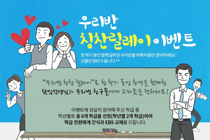 EBS중학이 이벤트 페이지를 통해 ‘우리반 칭찬릴레이’ 이벤트를 진행 중이다. 지난 6월 14일 시작된 이벤트는 오는 7월 4일까지 참여가능하다. 대상은 대한민국 모든 중학생 및 중학교 담임 선생님이며, 각 학년별로 2개 학급씩 총 6개 학급이 당첨된다.