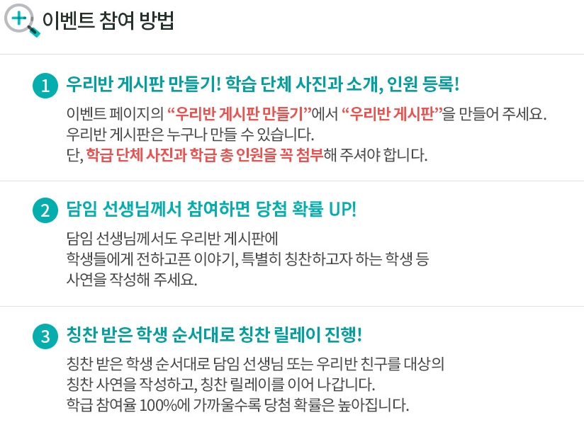 이벤트 참여 방법은 간단하다. 먼저 이벤트 페이지에 접속해 ‘우리반 게시판 만들기’에서 ‘우리반 게시판’을 만들어 학급 단체 사진과 학급 총 인원을 첨부한다. 이후 칭찬릴레이를 진행하는데 칭찬받은 학생 순서대로 담임 선생님 또는 같은 반 친구들을 대상으로 칭찬 사연을 작성하고 칭찬릴레이를 이어가면 된다.