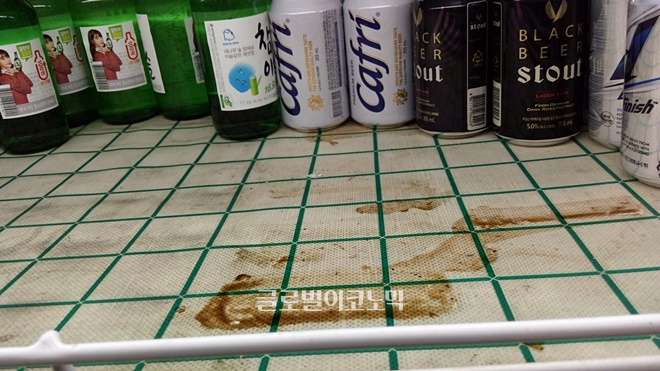음료코너(매장 끝부분)의 냉장고(가로 길이 50m 가량)에는 각종 이온음료, 생수, 맥주, 소주 등이 진열돼 있었다. 하지만 음료수 바로 밑에는 알수 없는 검정·갈색 이물질 자국과 먼지 등이 곳곳에 분포(장판에 묻어 있음)하고 있었다.