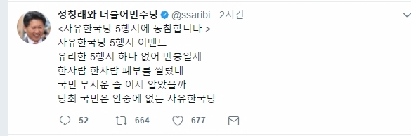 이미지 확대보기그는 “‘자’유한국당 5행시 이벤트 ‘유’리한 5행시 하나 없어 멘붕일세 ‘한’사람 한사람 폐부를 찔렀네 ‘국’민 무서운 줄 이제 알았을까 ‘당’최 국민은 안중에 없는 자유한국당”이라고 남겼다.