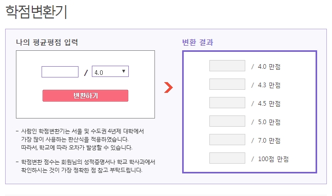 빈칸에 본인의 학점을 입력하고 선택창에 본인 학교 기준을 체크, ‘변환하기’를 누르면 다양한 기준에 맞게 학점이 자동 변환된다.