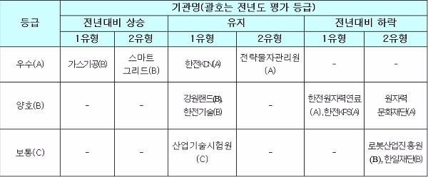 민간전문가로 구성된 평가단이 서면·현장 평가를 진행해 A~E 등급을 책정했다. A(우수)등급을 받은 공공기관은 가스기술공사와 한전KDN, 스마트그리드, 전략물자관리원 등 4곳이다.