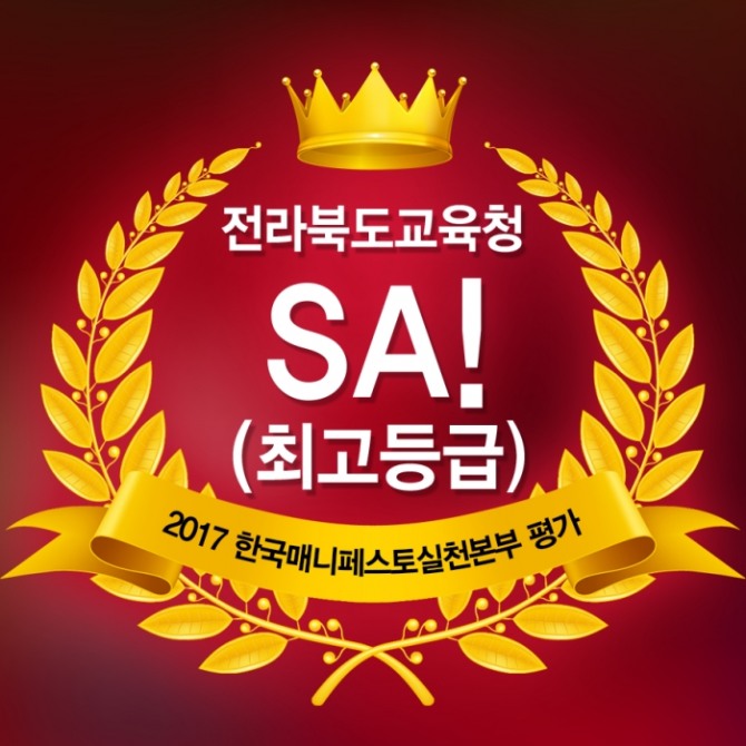 [글로벌이코노믹 조봉오 기자] 전북도교육청은 한국매니페스토실천본부가 주관한 ‘2017 전국 교육감 공약이행 및 정보공개 평가’에서 최고등급인 SA를 받았다고 5일 밝혔다.전북교육청은 분야별 평가에서 전라북도교육청은 공약이행완료 분야와 2016년 목표달성 분야에서 우수한 평가를 받았다. 김승환 전북교육감의 공약사업은 안전한 학교, 참된 학력신장, 교육정의 실현, 교육복지 확대, 농어촌 및 원도심학교 활성화 등 5대 분야 41개 사업이다.