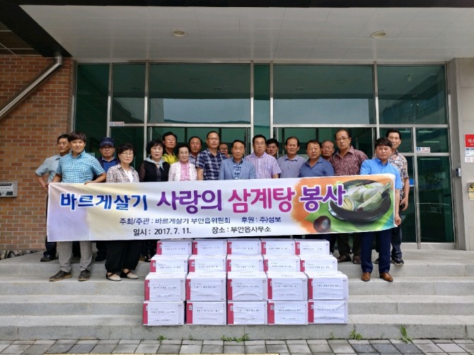 [글로벌이코노믹 김홍균 기자] 전북 부안군 부안읍 바르게살기위원회는 11일 부안읍 관내 어르신들을 위한 사랑의 삼계탕 나눔 행사를 가졌다.